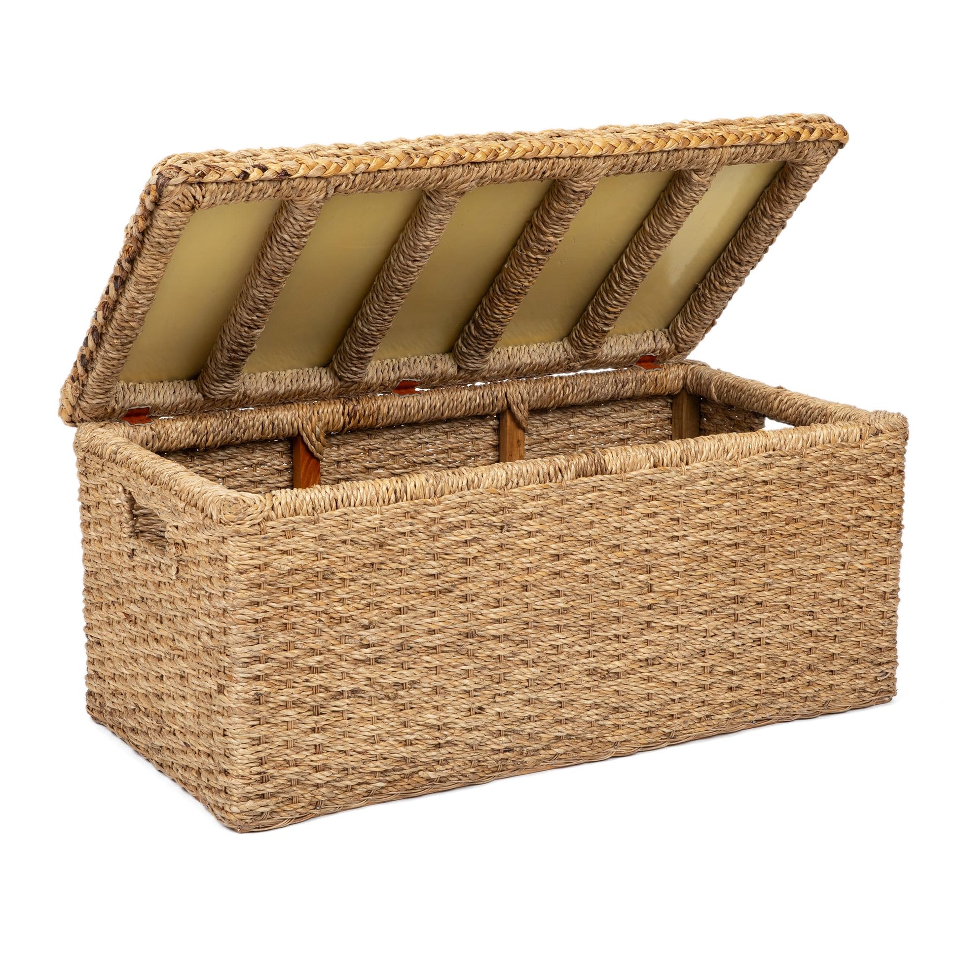 - Handmade: The trunk is expertly crafted by artisans in Nicaragua using fair trade practices to create a truly beautiful rope weave around the heavy duty wood rectangular box ottoman frame that includes a handle.