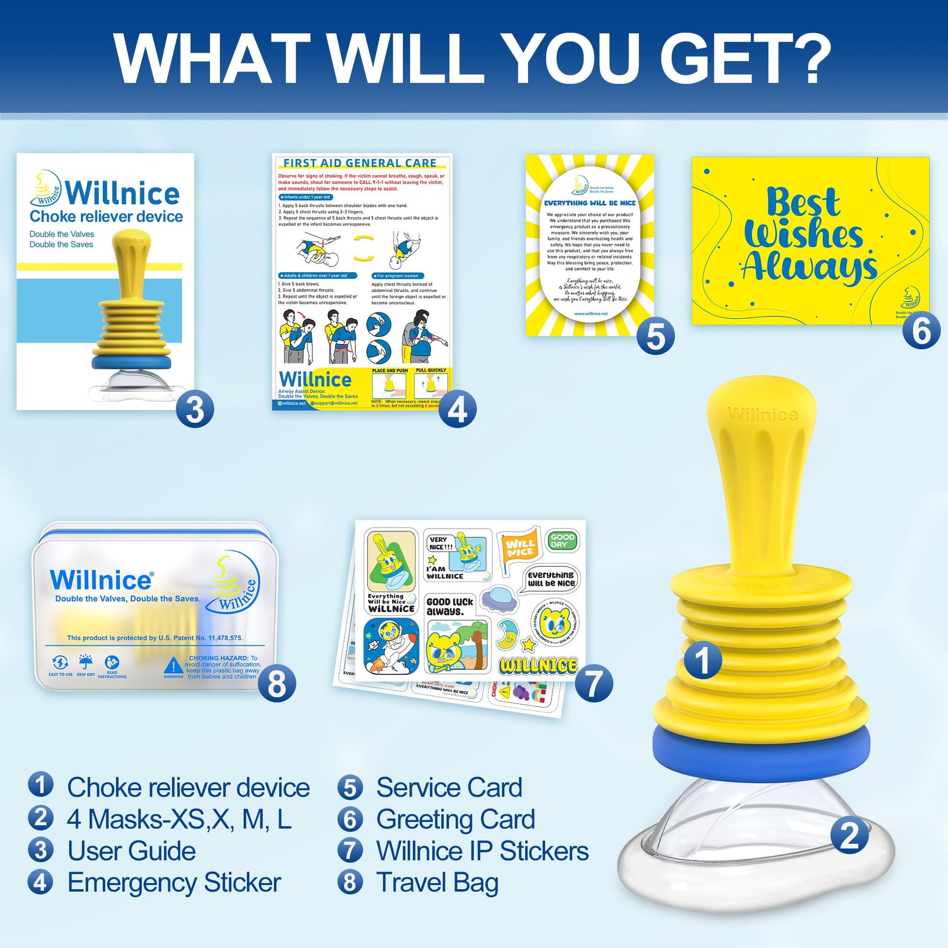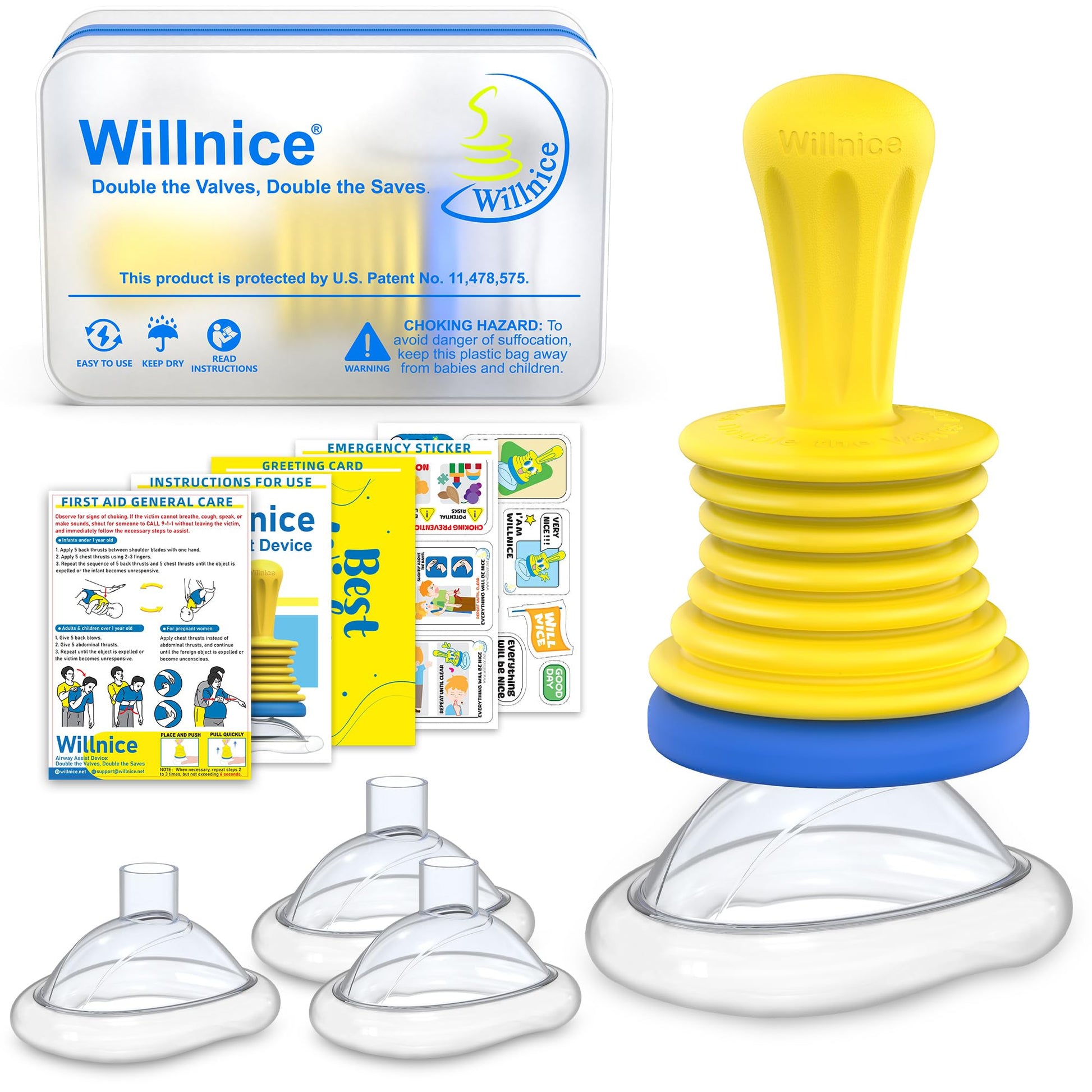 - One Pack for All: This choking rescue device offers 4 different-sized (XS, S, M, L) to meet the needs of all age groups - toddlers, children, adults and elderly. This choking rescue device hopes to give you peace of mind, and hopefully will never be used.