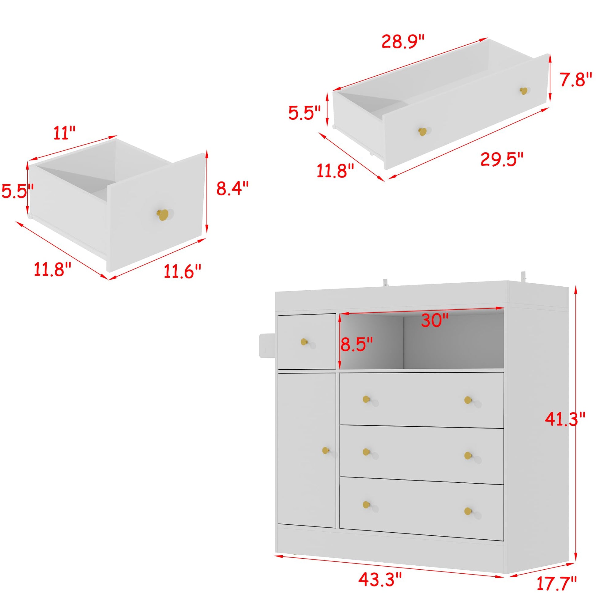 - [Stylish & Functional] - The white finish with gold handles is elegant and stylish, helping you create a cozy nursery. With 4 drawers and 2 shelves, it is convenient for you to store and organize clothes, toys and other baby's items. And the open shelves can organize grab-and-go items. Changing table dimensions: 17.7"D x 43.3"W x 41.3"H