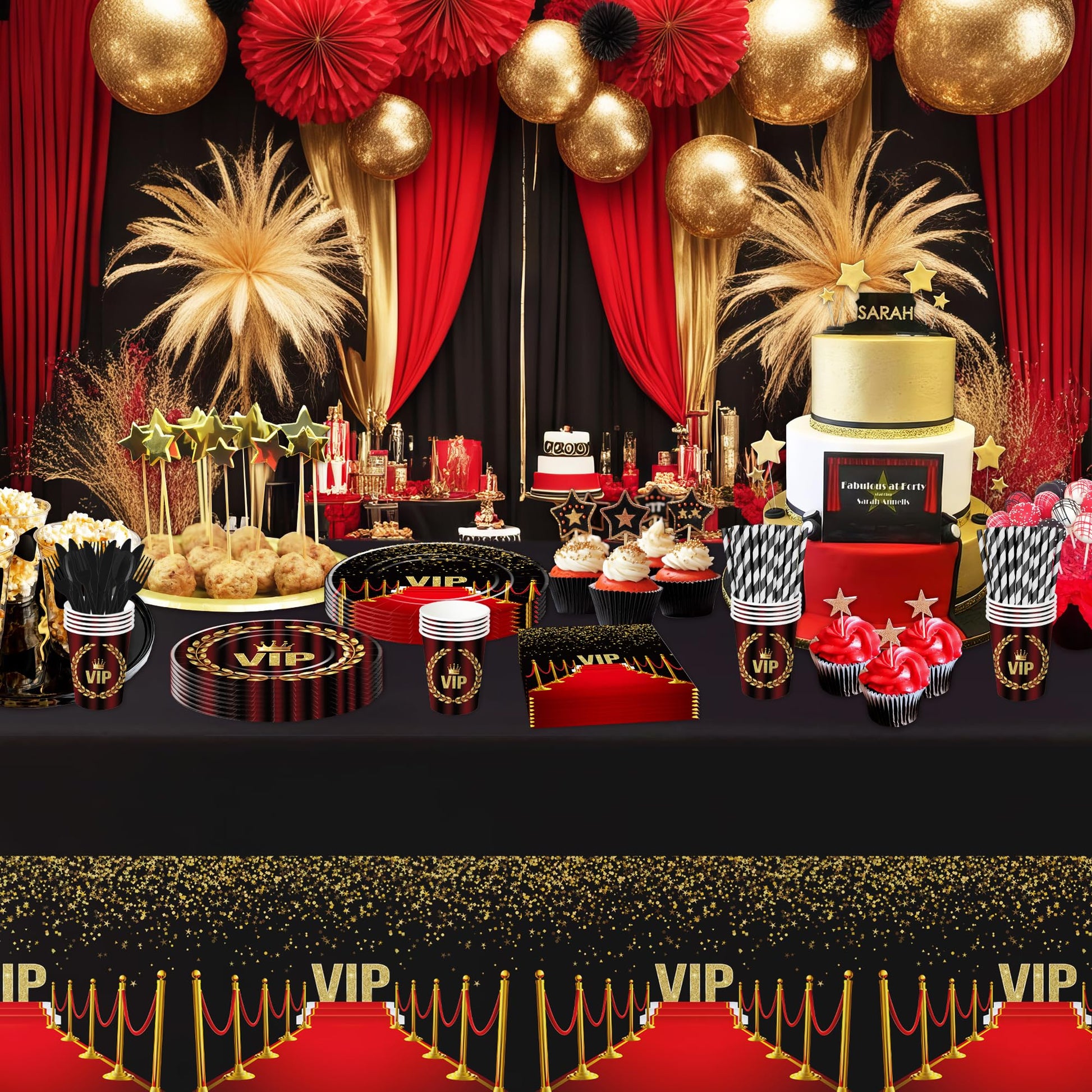 - This VIP party supplies tableware set can accommodate up to 24 guests and includes everything you need: 24pcs 9'' VIP dinner plates, 24pcs 7'' red carpet dessert plates, 24pcs napkins, 24pcs cups, 24 sets of disposable cutlery, 24pcs paper straws, 2pcs VIP tablecloths. Get these red carpet birthday party decorations to elevate your celebration