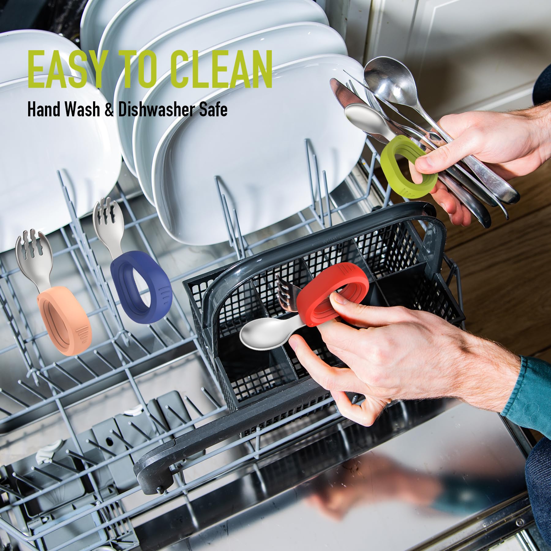 - [Hollow handle design for stable grip] The baby Utensil has a hollow ring handle that fits where a baby makes a fist. It's made of flexible food-grade silicone that's safe to chew, and when eating, baby can grab the soft handle with one hand or put a finger into the loop, making it easy for baby to eat.