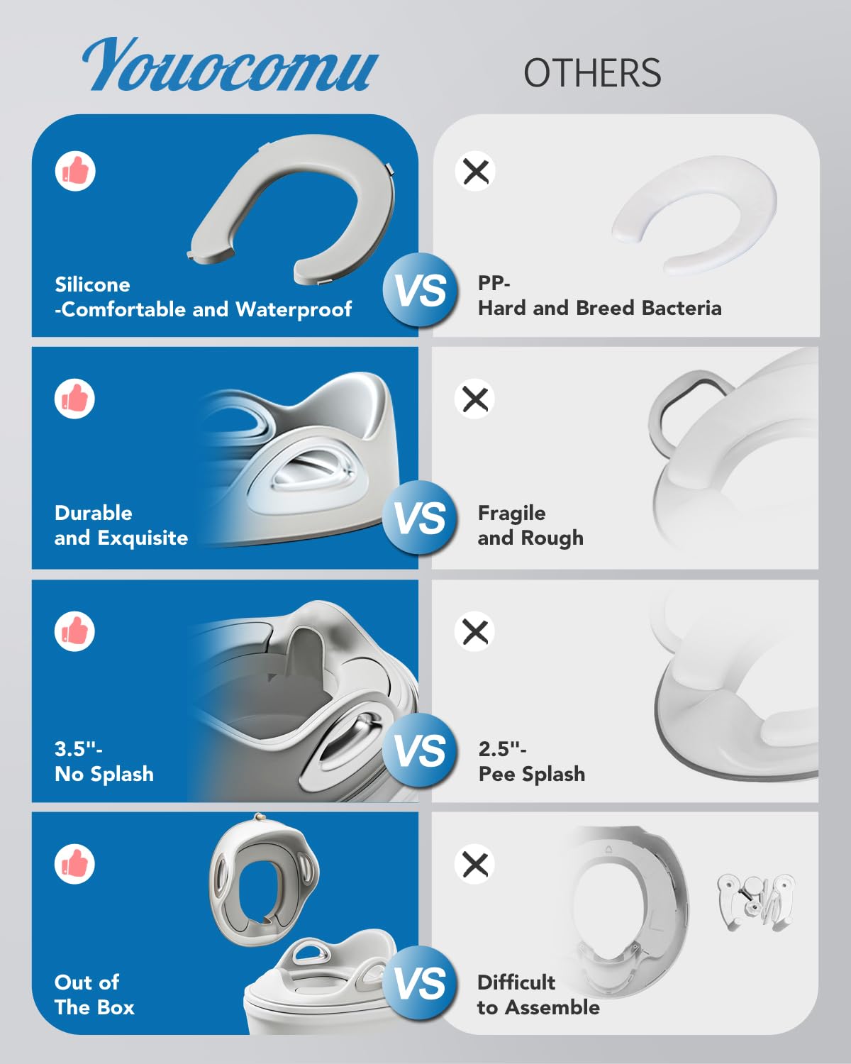 Youocomu Potty Training Toilet Seat, Toddler Toilet Seat Attachment with Safety Handles, Detachable Soft Cushion, Anti-Slip Design and Splash Guard, Baby Toilet Seats for Kids, Boys and Girls (Grey)